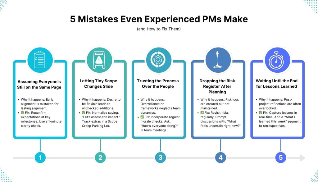 Here’s the truth: You can have 10+ years of experience and still fall into these traps. What separates great project managers isn’t perfection, it’s self-awareness, adaptability, and course correction.