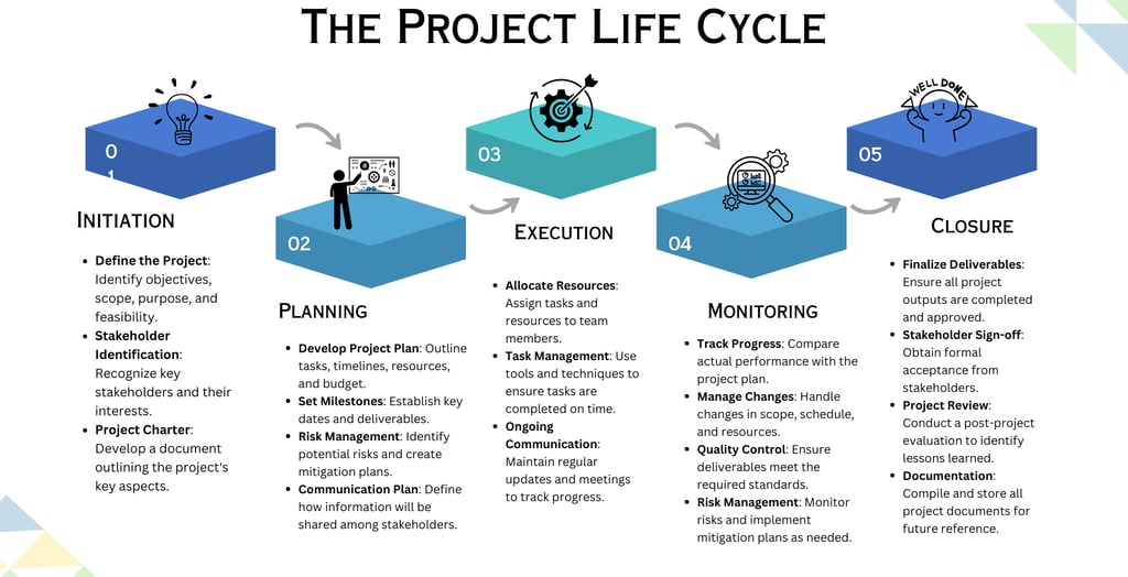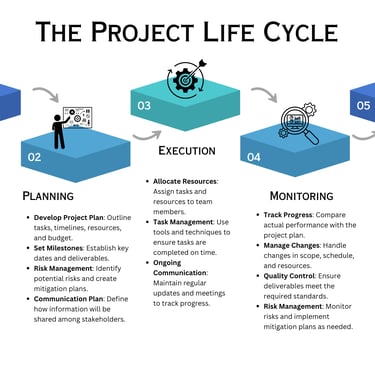 Risk Management: Identifying potential risks early and setting up triggers for necessary actions are key steps in effective project management. Utilizing project management tools such as Asana for task management, Trello for visual workflow depiction, and Jira for agile project management, helps maintain project momentum and address issues proactively.