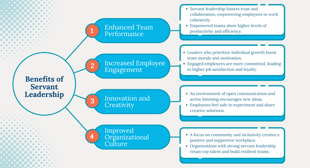 Improved Organizational Culture: Servant leadership creates an inclusive and positive work environment that attracts and retains top talent.