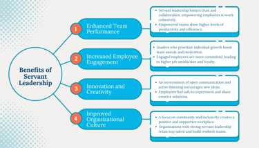 Enhanced Team Performance: By fostering a supportive and collaborative environment, servant leaders inspire teams to perform at their best.